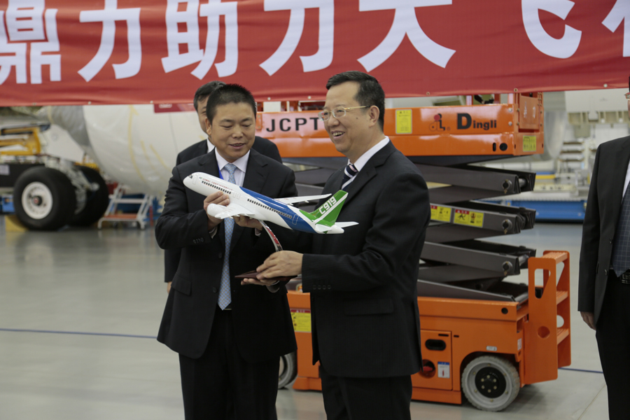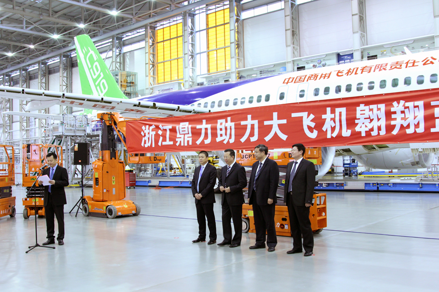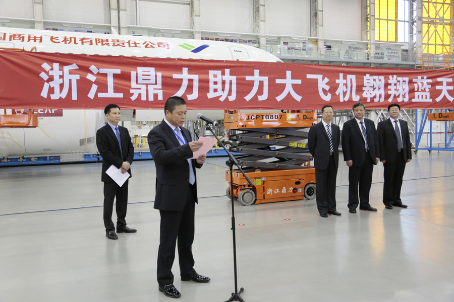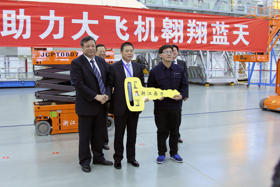 2015年11月24日,在中国商用飞机有限责任公司的总装制造中心上海浦东基地内,浙江鼎力向中国商飞公司隆重交付了首批智能高空作业设备,主要用于飞机的总装制造、检修和维护等,宣告安全高效的国产智能高空作业设备正式助力国产大飞机的制造。出席本次交机仪式的嘉宾有中国商用飞机有限责任公司副总经理刘林宗、中国商用飞机有限责任公司总经理助理兼上飞公司总经理沈卫国、上飞公司党委书记肖云、上飞公司副总经理任彬、浙江鼎力机械股份有限公司董事长许树根、浙江鼎力销售副总经理陈金晨、浙江鼎力内销部经理向存云及双方公司代表200余人。