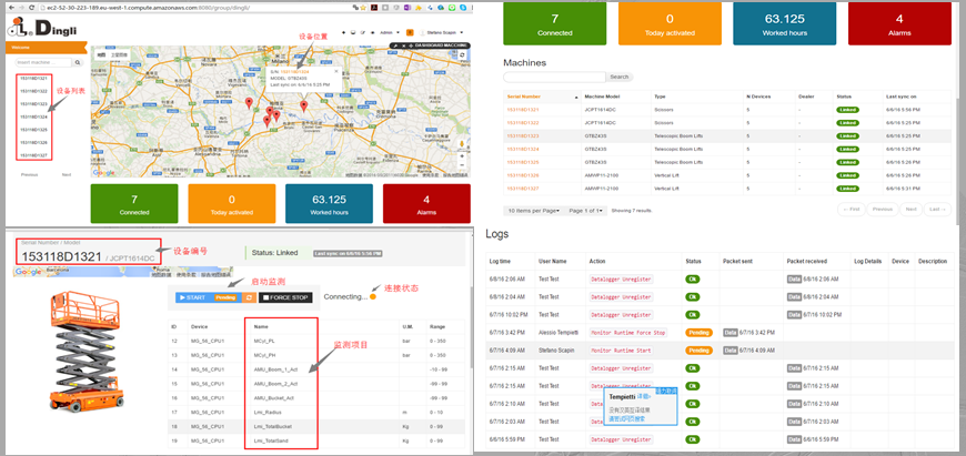 鼎力远程监控与管理平台,采用(Amazon,亚马逊)互联服务器平台,具备全球互联功能,能完全兼容和采集设备全部的信息状态,实现真正远程升级程序的能力。配合设备管理、服务支持、市场分析、统计管理(数据统计及权限管理)这四方面进行功能设计,通过GPS、移动网络,对作业现场设备的位置、故障、报警等信息进行传递和管理,可以让工程师足不出户进行全球设备维护和信息互通。