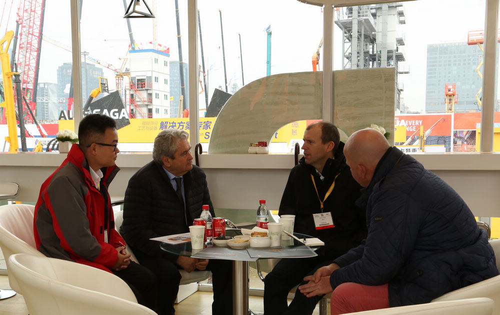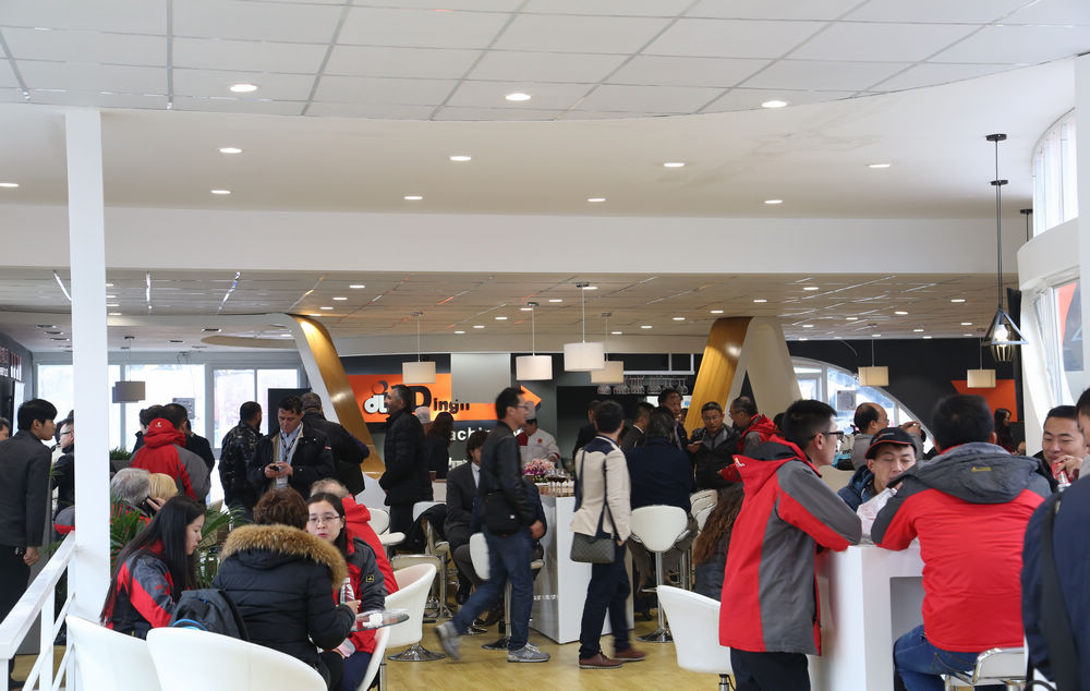 在洽谈区,来自不同国家、不同语言的参观客户汇聚一堂,人流如织。鼎力销售人员以热情的服务为客户提供专业的产品介绍。