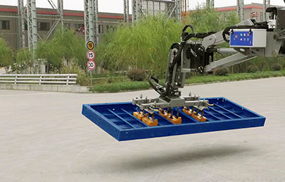 智能机器人模板举升车作业时,首先通过操作机器手臂将电永磁吸盘装置对准模板网格,当电永磁铁表面距离模板底部一定高度时,压紧油缸伸出,吸盘装置压紧模板,此时电永磁铁通电,模板被吸合,从而轻松自如完成施工作业。
