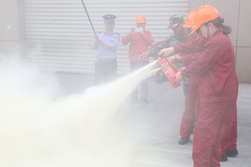 紧接着是灭火器演练,参与演练的员工在吴教官的细心指导下,逐一使用灭火器对模拟着火点和煤气罐进行扑灭。吴教官对部分员工不规范的灭火动作进行了纠正,使大家亲身体验并掌握灭火器的使用要领,从而进行及时有效灭火。
