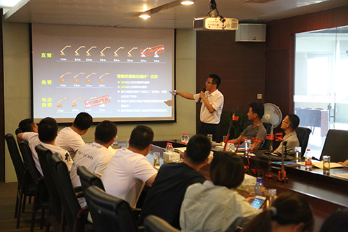 在会议室,技术人员首先对新臂式系列产品进行了深入细致地讲解,让租赁公司客户们了解了新臂式的设计研发过程、基本参数性能、各类配置保障及独特优势亮点等内容。