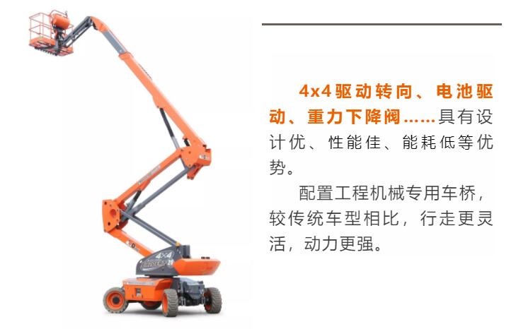 ▶ 最大工作高度22米,工作人数多人。 ▶ 全行程最大负载750kg,且整机可正常行走。 ▶ 工作平台尺寸4,59m*2,25m,延伸平台尺寸2,7m,作业范围更广。 ▶ 整机离地间隙更高,达到0,4m,通过性更强。 ▶4x4驱动转向,转弯半径1,25m/3 西瓜影视资源,4m,灵活性更高。3、车桥款电动曲臂:BA20ERT。