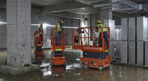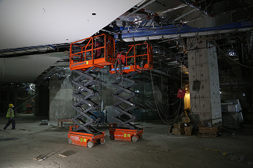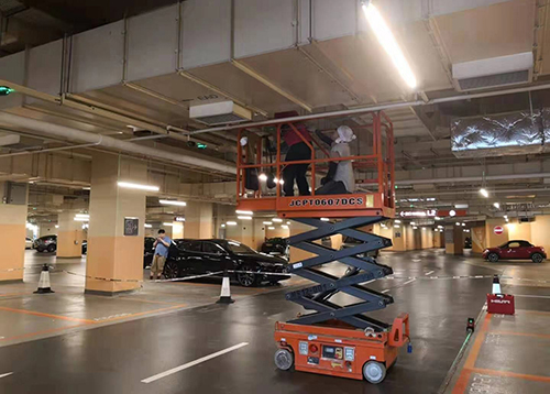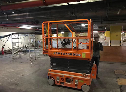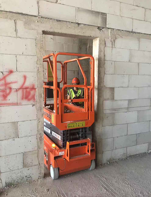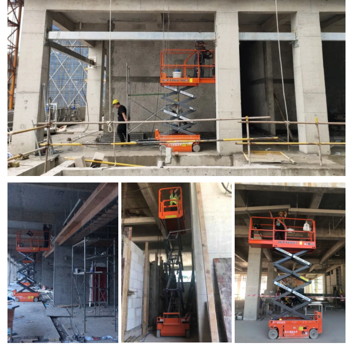 该项目内部楼层间,普遍层高为3~4米,中大型高空作业平台大材小用,结合实际作业环境,该项目选取了通过性强、可灵活进出客梯的小剪叉。